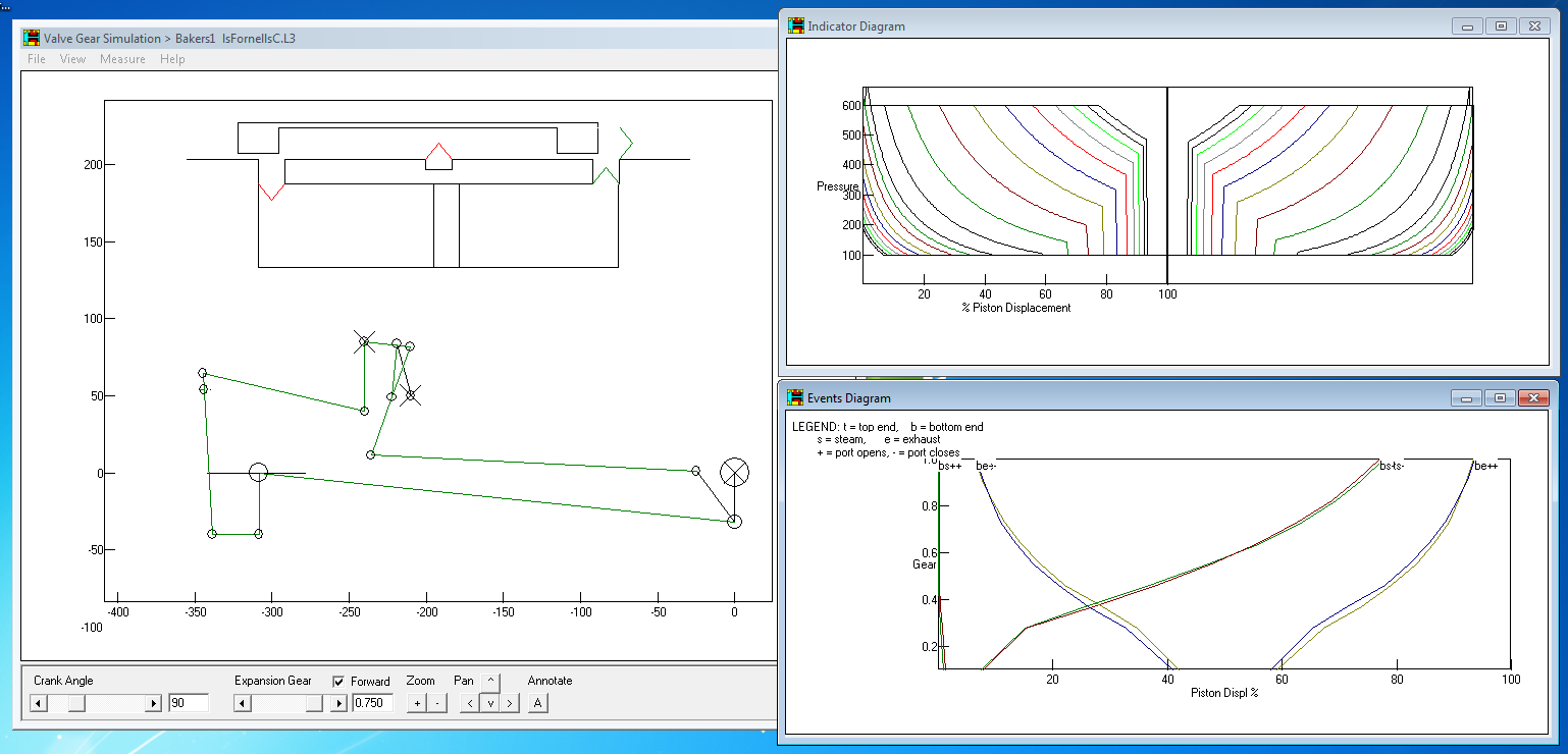 Per dissenyar la geometria he seguit essencialment el llibre de Don Ashton mencionat al primer post del bloc. El llibre no tracta el tipus Baker, però el Walschaert n’és prou similar com per poder utilitzar-lo. Algunes mides les he determinat directament a partir del dibuix amb CAD, com la palanca de precisió (“combination lever”), el cigonyal excèntric (“return crank”) i la viela lliscant (“valve rod”) seguint les recomanacions del llibre. Després he utilitzat simulació per optimitzar els events. Per les simulacions he baixat el software recomanat en el llibre.