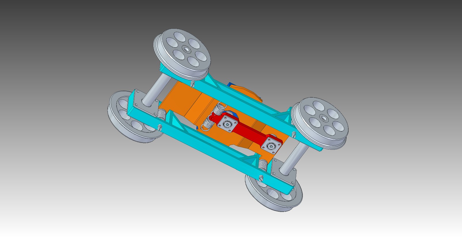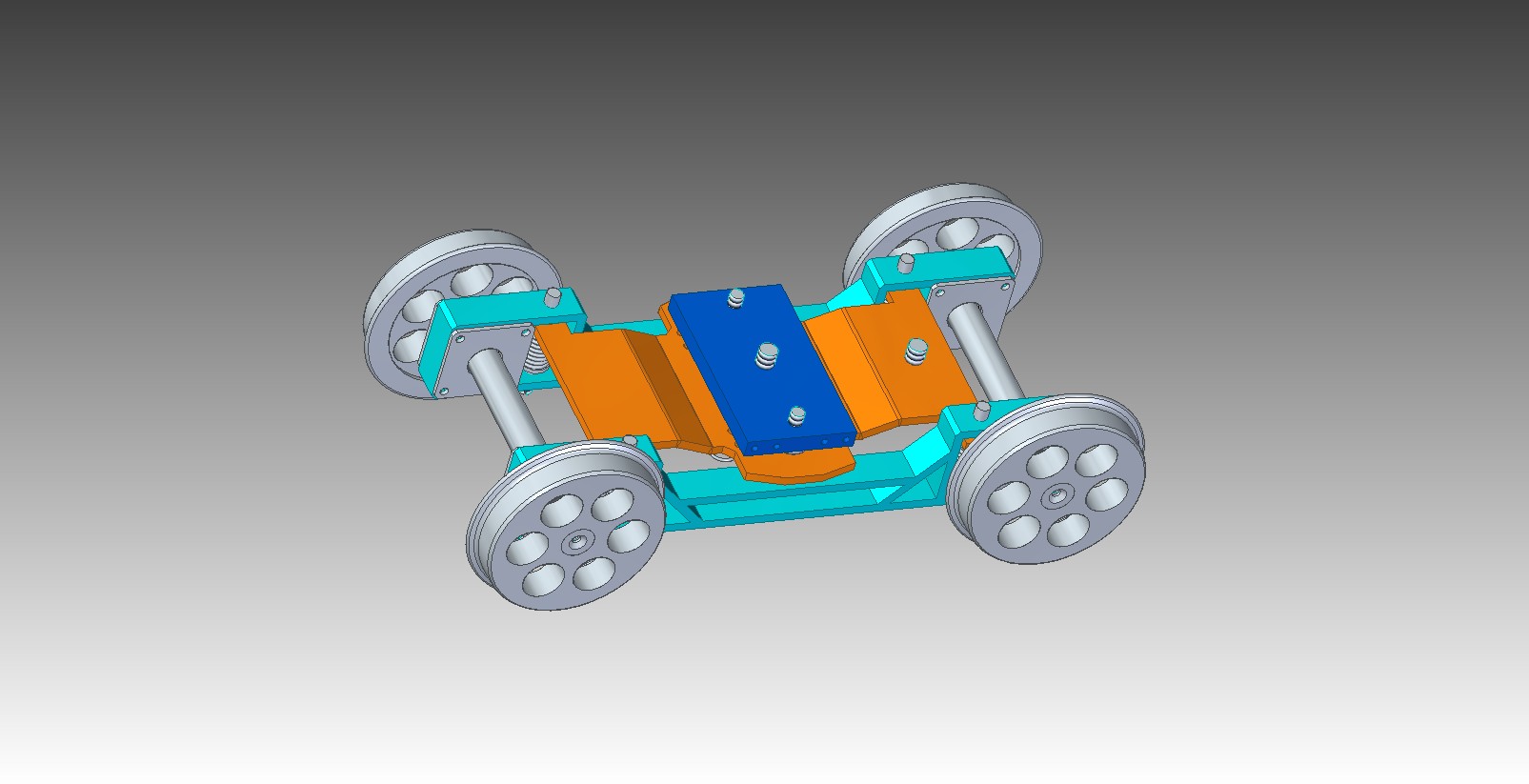 1 – Els sub-xasis (blau cel) amb els eixos i rodes són flotants i permeten tots els graus de llibertat necessaris a les rodes. Els coixinets de les rodes son auto-alineants.